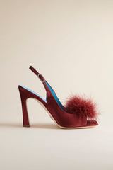 A quintessential sparkle all wrapped up in an oxblood pump. Easy to wear, even easier to love. Embellished with a Swarovski Crystal buckle and dusting of feathers on the toe.