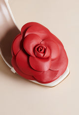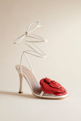 The Lilia High Sandal in Ivory comes with patent leather straps, and beautiful oversized leather red rose on the upper.