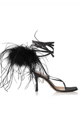 Our strappy heeled thong sandal, with flat leather lacing and a cloud of feather at your heel.