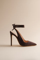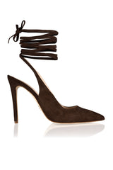 Heeled Pump with laces rendered in suede. Heel height is 4 inches.