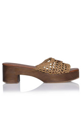 Our Aquarius Clog is made with handwoven raffia on a wood sole.