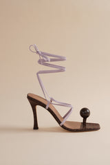 The Globe Sandal has quickly become a fan favorite. She's reimagined in an espresso faux croc with lavender suede strappy sandals, and a signature wooden globe.