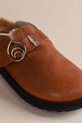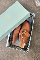 This shoe is handmade with a leather vamp and shearling lined interior.