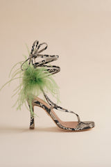 Our strappy heeled thong sandal in black and white faux snake with flat leather lacing and a cloud of green feathers at your heel.