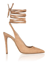 Heeled Pump with laces rendered in suede. Heel height is 4 inches.