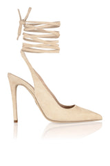 Heeled Pump with laces rendered in suede. Heel height is 4 inches.