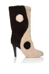 Our 2020 Boot in Yin Yang patchwork dark brown and cream shearling.