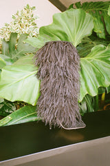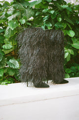 A to the knee black boot adorned with black feathers for a whimsical show stopping entrance wherever you go.